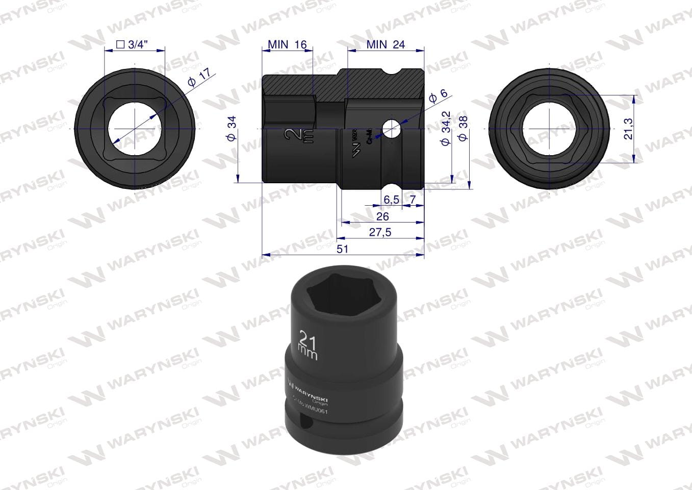 Nasadka udarowa sześciokątna 3/4". 21 mm. CrMo. DIN 3129. Waryński