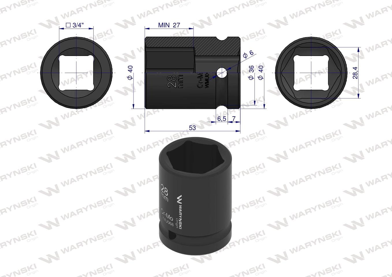 Nasadka udarowa sześciokątna 3/4". 28 mm. CrMo. DIN 3129. Waryński