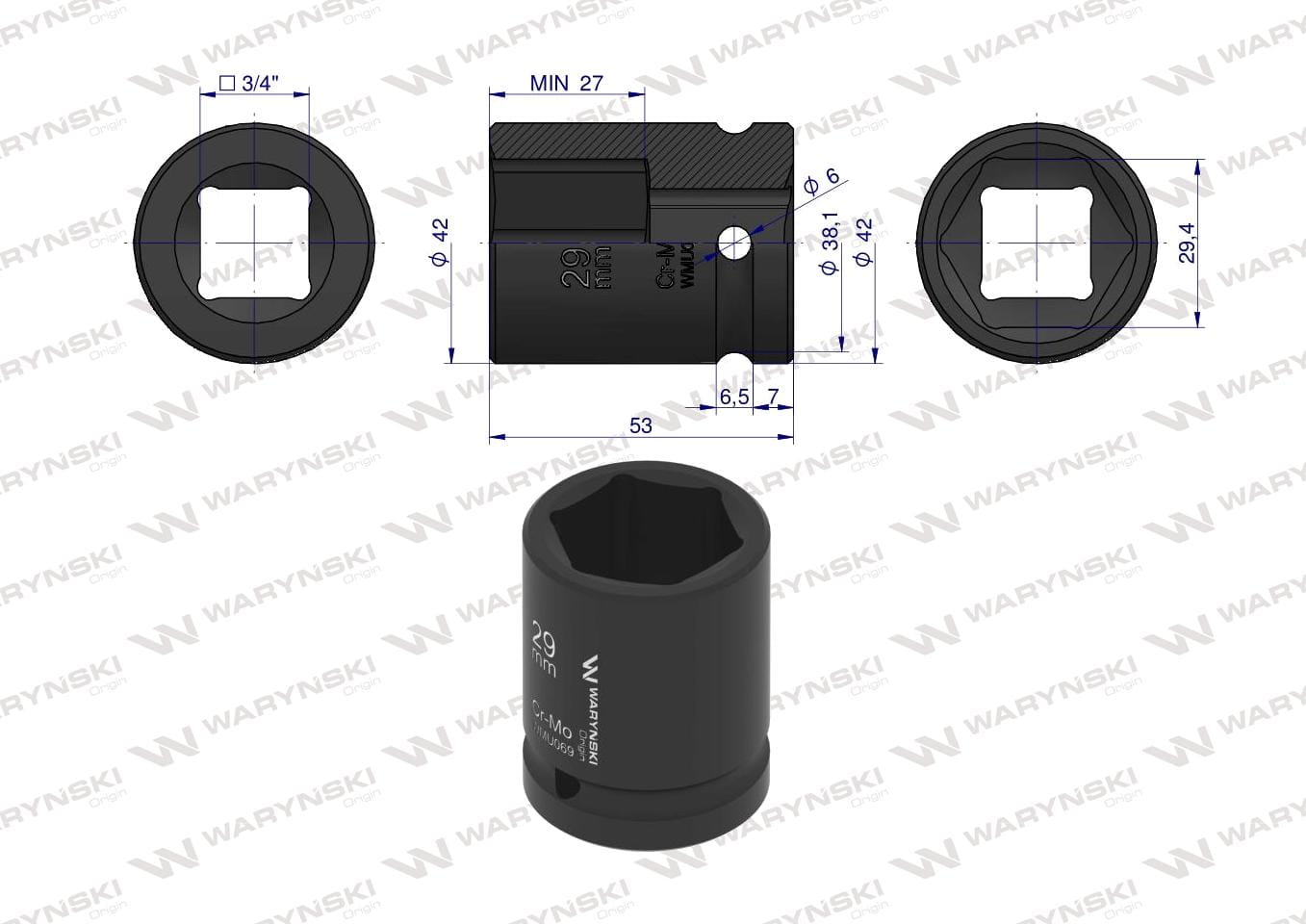 Nasadka udarowa sześciokątna 3/4". 29 mm. CrMo. DIN 3129. Waryński