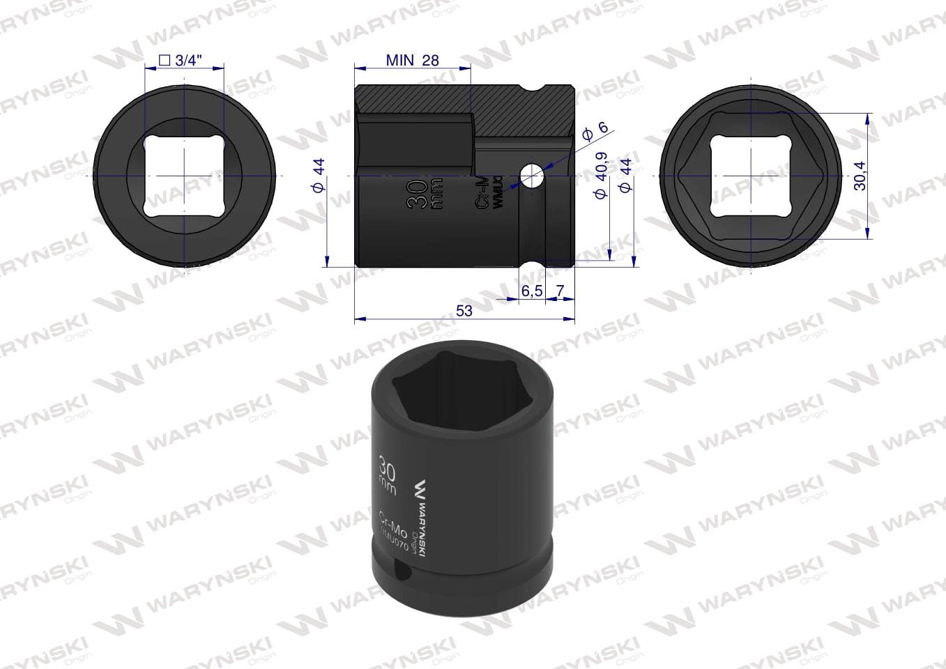 Nasadka udarowa sześciokątna 3/4". 30 mm. CrMo. DIN 3129. Waryński