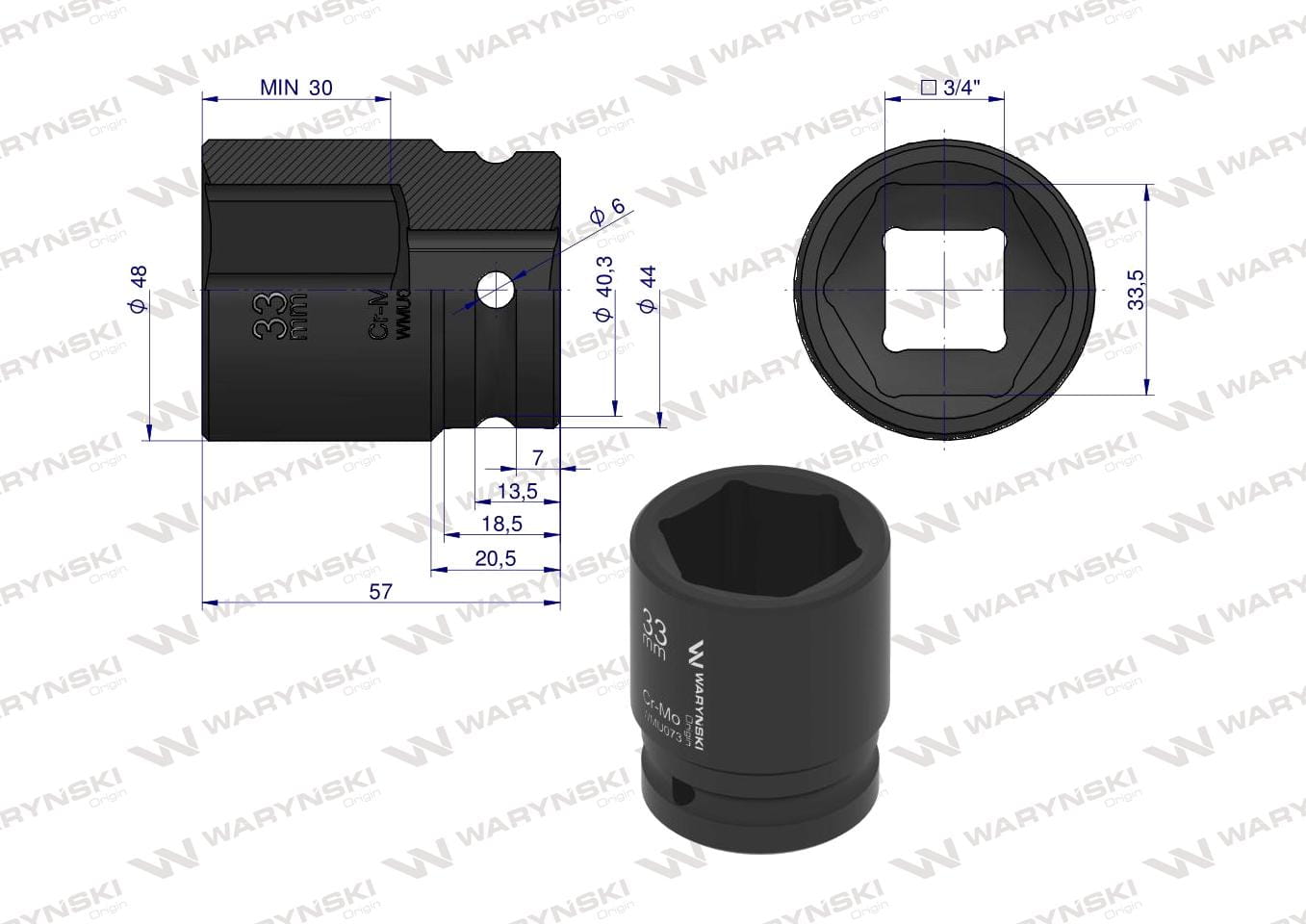 Nasadka udarowa sześciokątna 3/4". 33 mm. CrMo. DIN 3129. Waryński