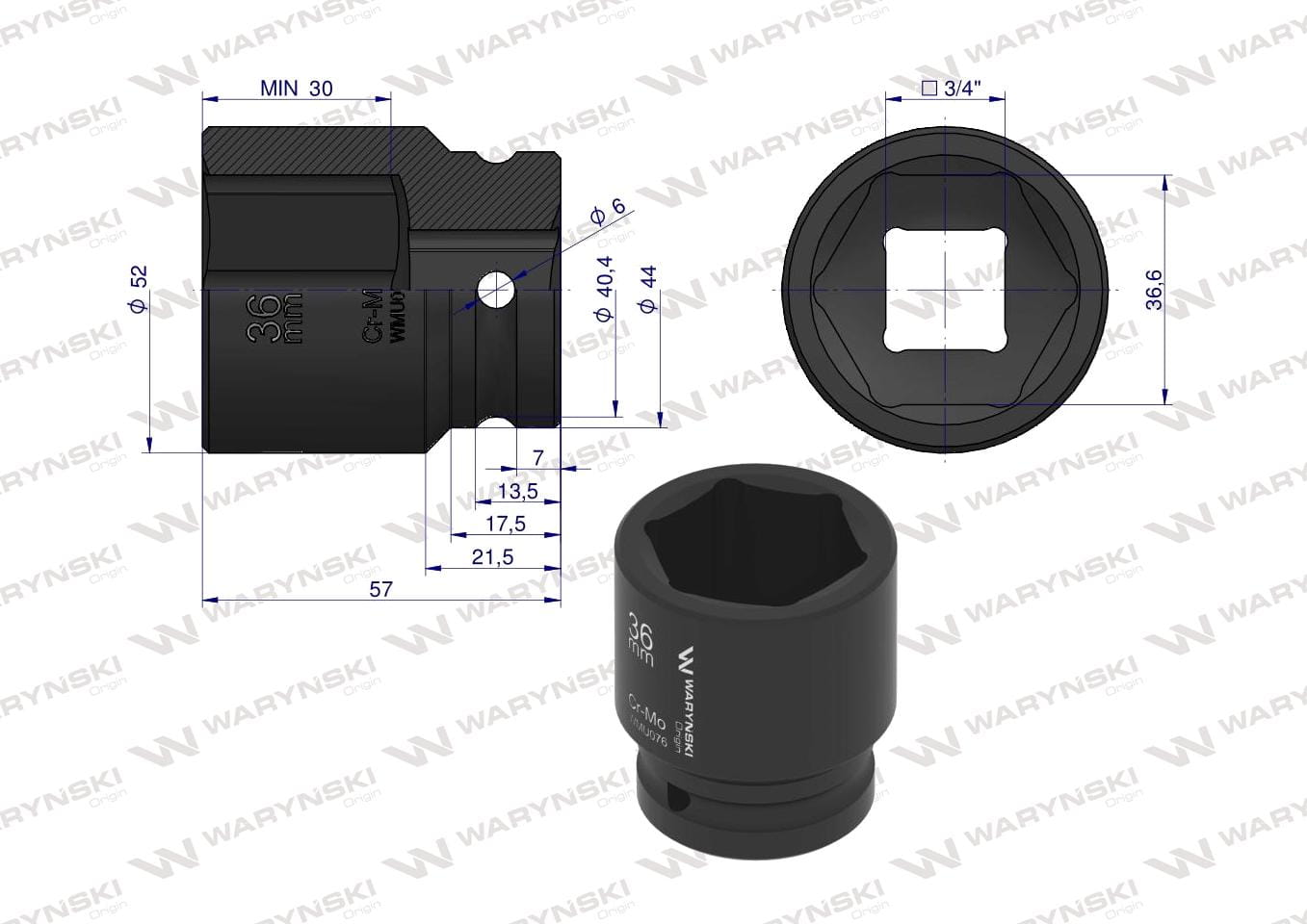 Nasadka udarowa sześciokątna 3/4". 36 mm. CrMo. DIN 3129. Waryński