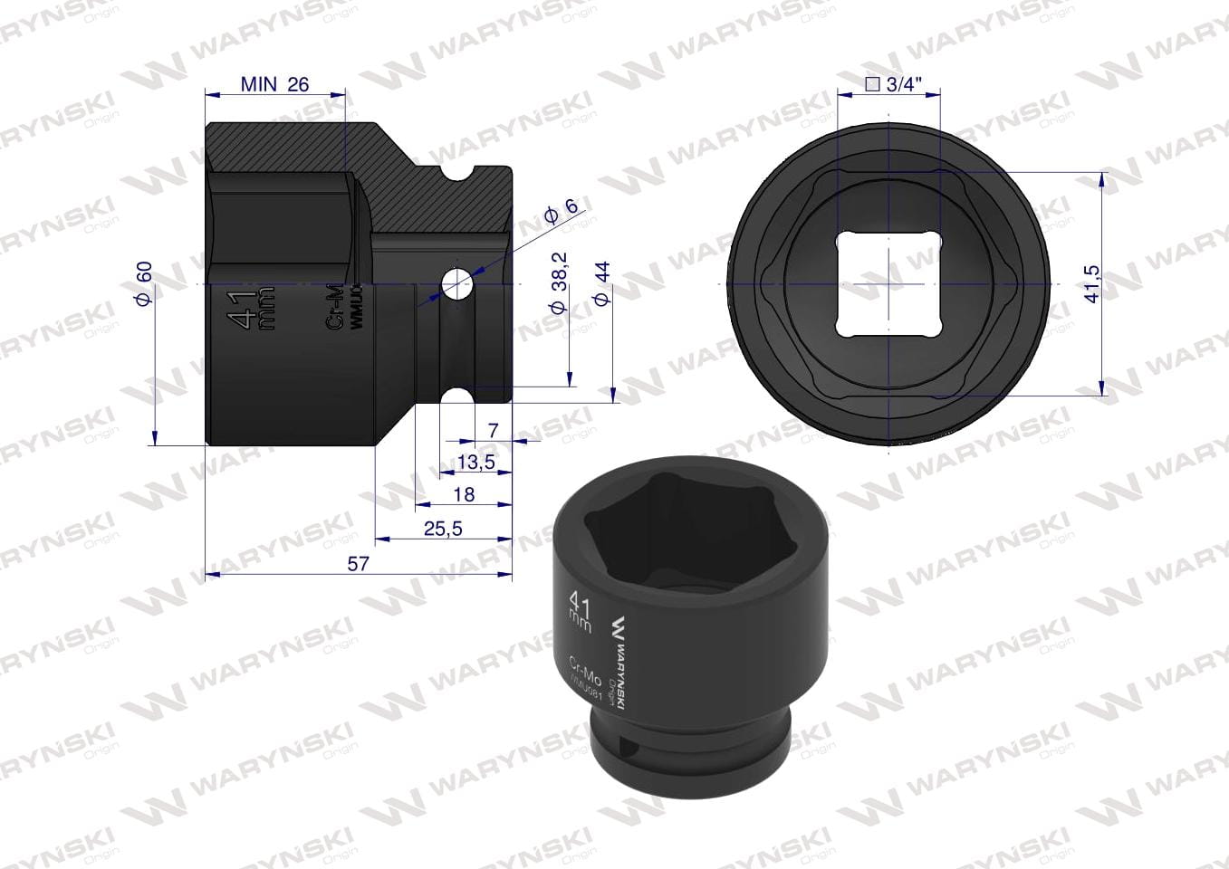 Nasadka udarowa sześciokątna 3/4". 41 mm. CrMo. DIN 3129. Waryński