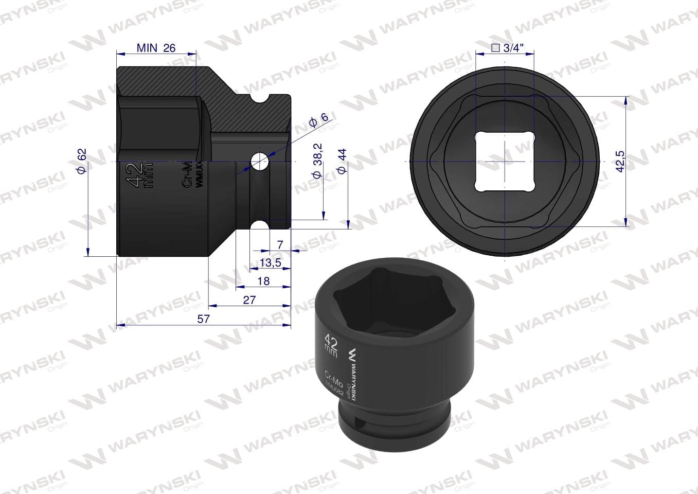Nasadka udarowa sześciokątna 3/4". 42 mm. CrMo. DIN 3129. Waryński