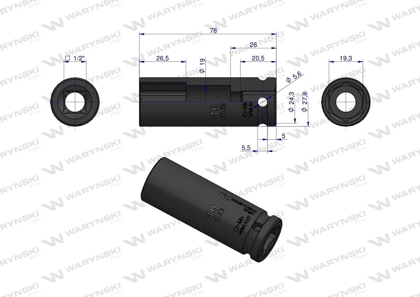 Nasadka udarowa sześciokątna długa 1/2" 19 mm CrMo DIN 3129 Waryński