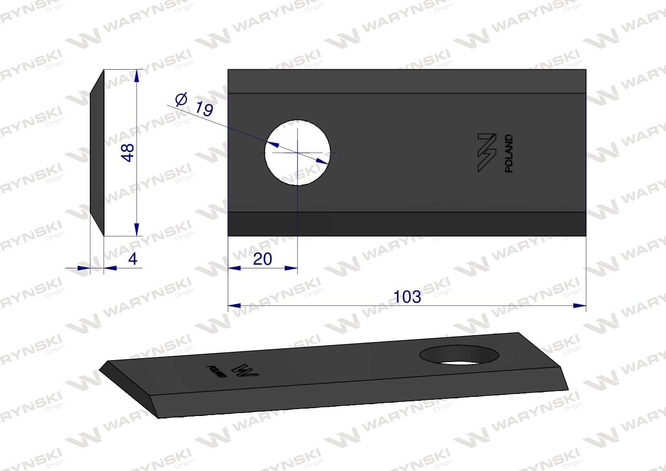 Nóż nożyk kosiarka 103X48X4mm otwór 19 zastosowanie 122331 Fella WARYŃSKI