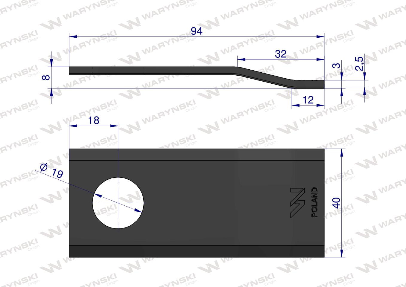 Nóż nożyk kosiarka gięty 94X40X3mm otwór 19 zastosowanie Deutz Fahr 94/P 1101701015322 WARYŃSKI