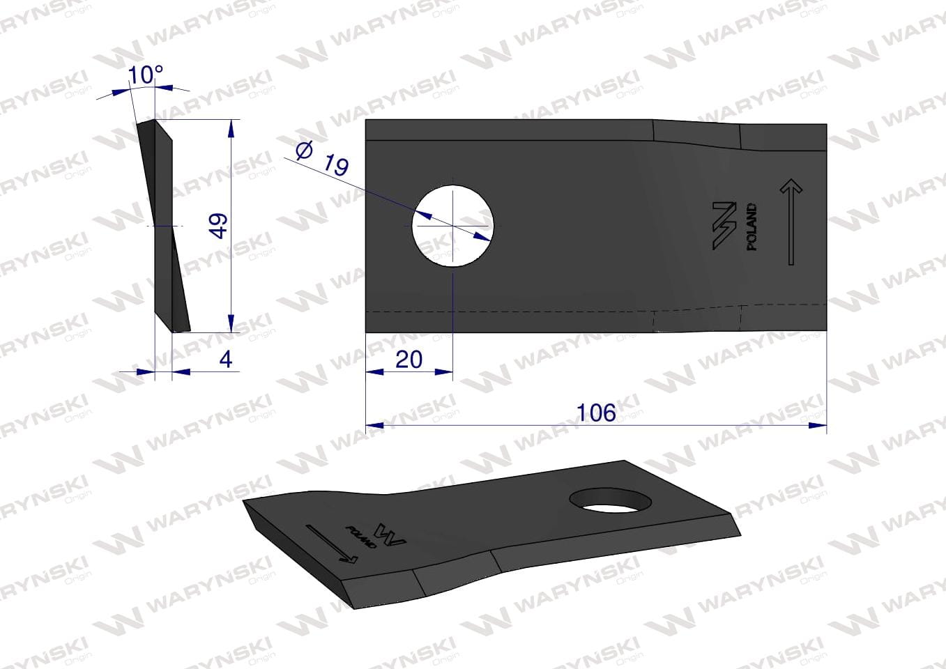 Nóż nożyk kosiarka lewy 106x48x4mm otwór 19 zastosowanie 122329 Fella WARYŃSKI
