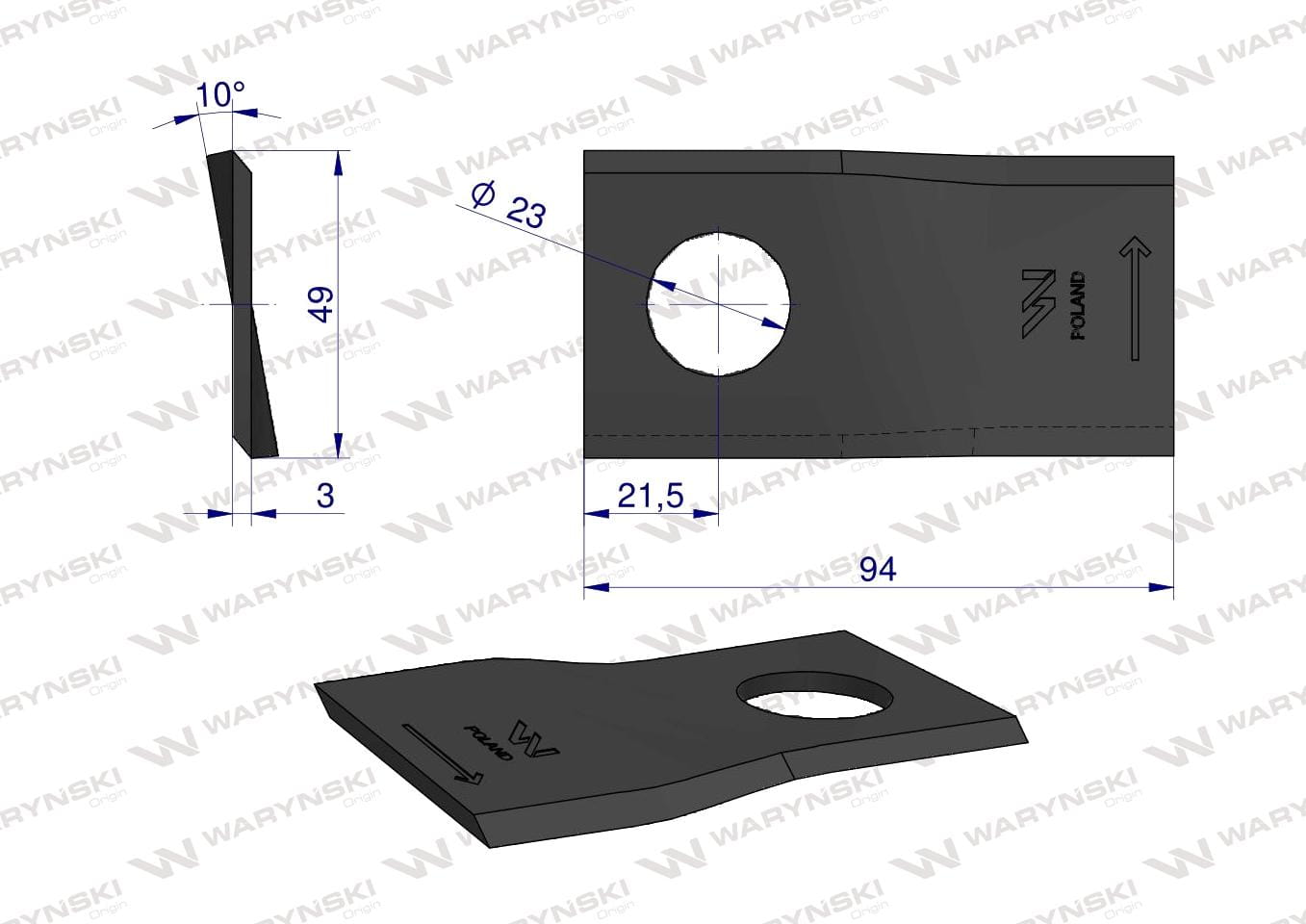 Nóż nożyk kosiarka lewy 94x48x3mm otwór 19 zastosowanie 570409 Niemeyer Kverneland WARYŃSKI