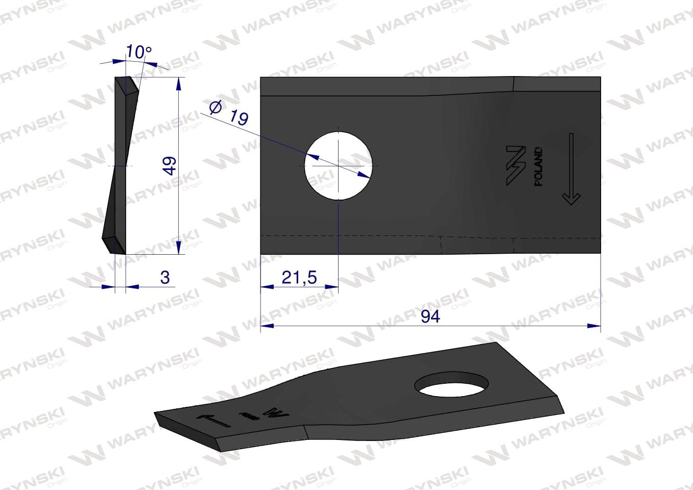 Nóż nożyk kosiarka prawy 94x48x3mm otwór 19 zastosowanie 570410 Niemeyer Kverneland WARYŃSKI