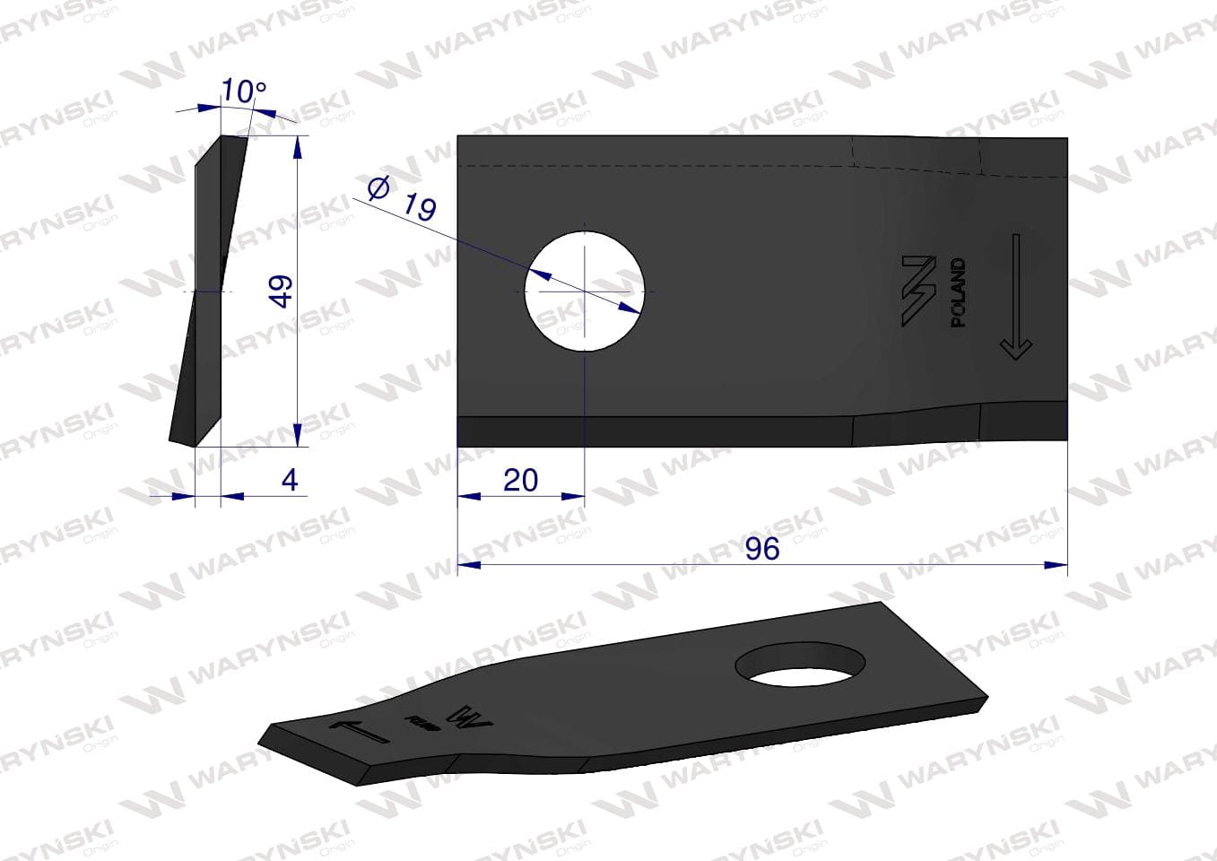 Nóż nożyk kosiarka prawy 96x48x4mm otwór 19 zastosowanie 16503464 Deutz-Fahr WARYŃSKI