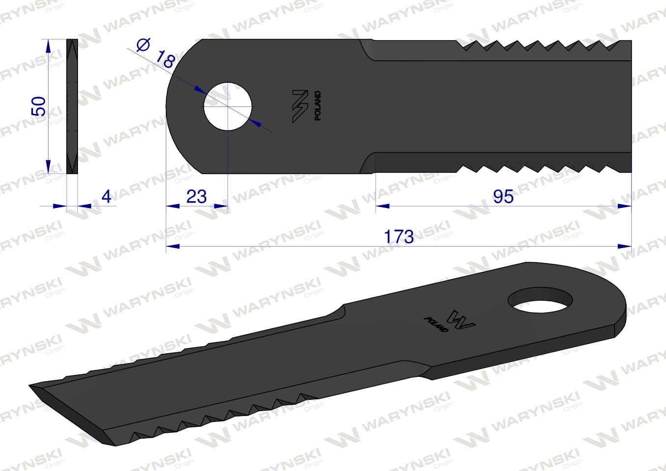 Nóż obrotowy rozdrabniacz słomy sieczkarnia 173x50x4mm otwór 18 zastosowanie 600174 John Deere MF New Holland WARYŃSKI