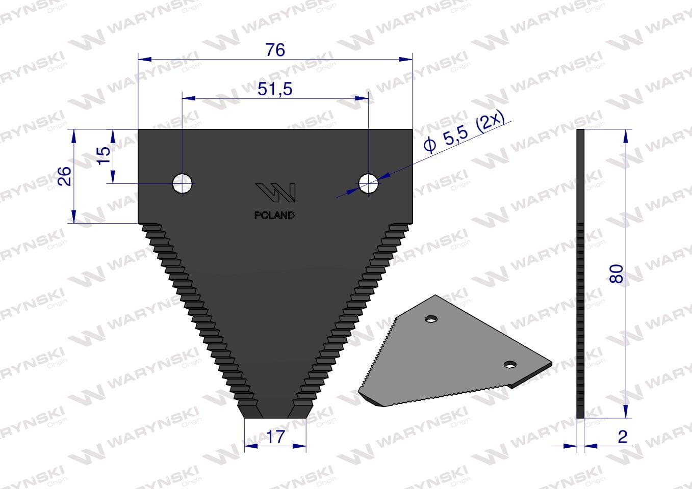 Nóż żniwny 80x76x2mm otwór 5.5 zastosowanie 614670.0 Claas WARYŃSKI ( sprzedawane po 25 )