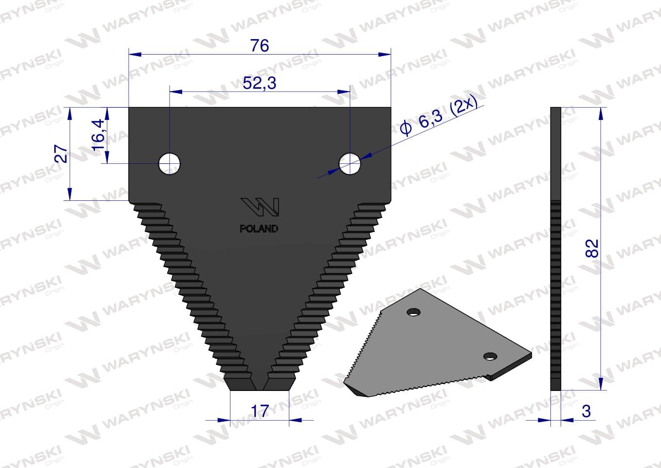 Nóż żniwny 82x76x3mm otwór 6.3 zastosowanie D44103700N Claas Massey Ferguson WARYŃSKI ( sprzedawane po 25 )