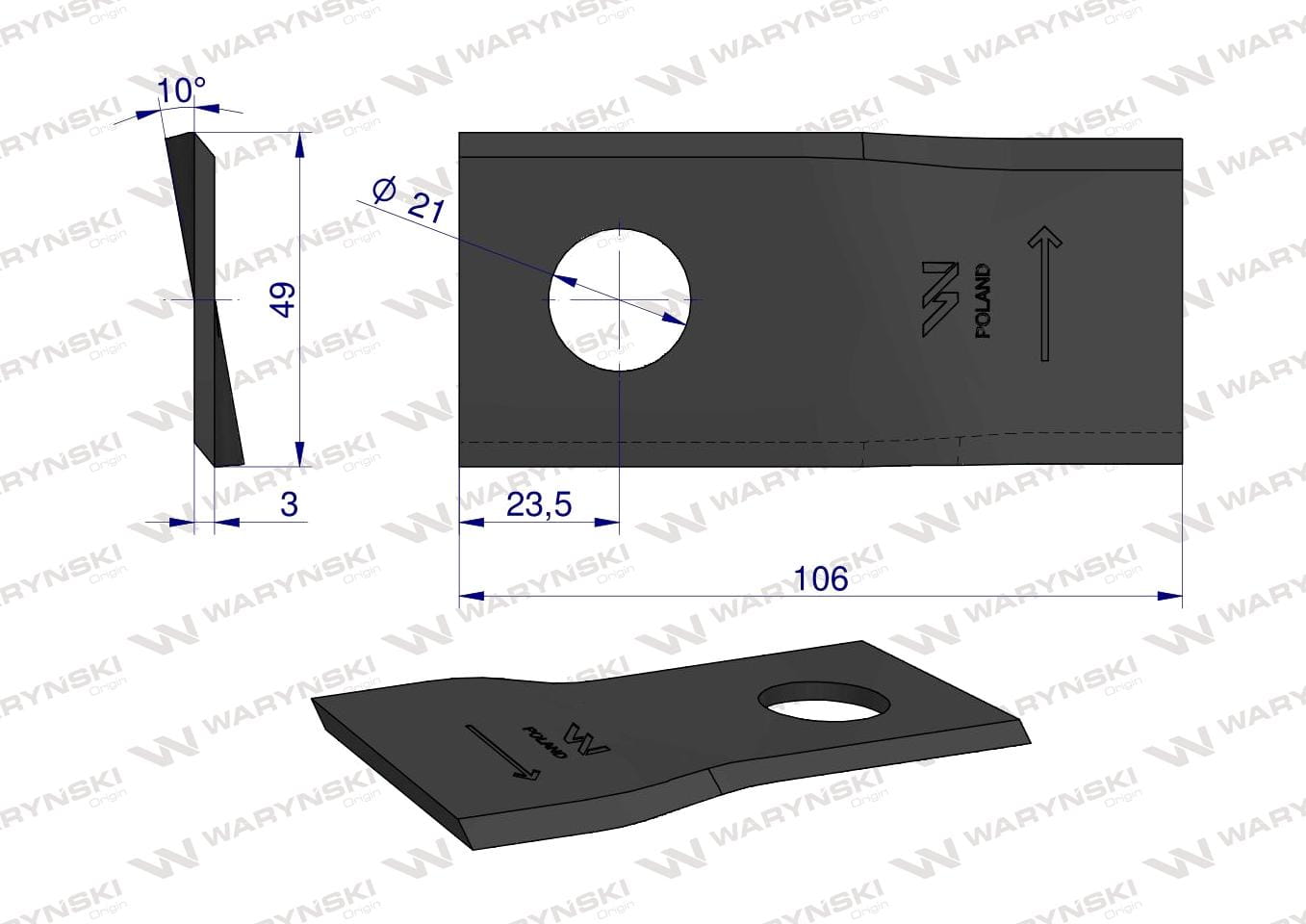 Nóż. nożyk kosiarka lewy 106x48x3mm otwór 21 zastosowanie 1042660 Claas WARYŃSKI ( sprzedawane po 25 )