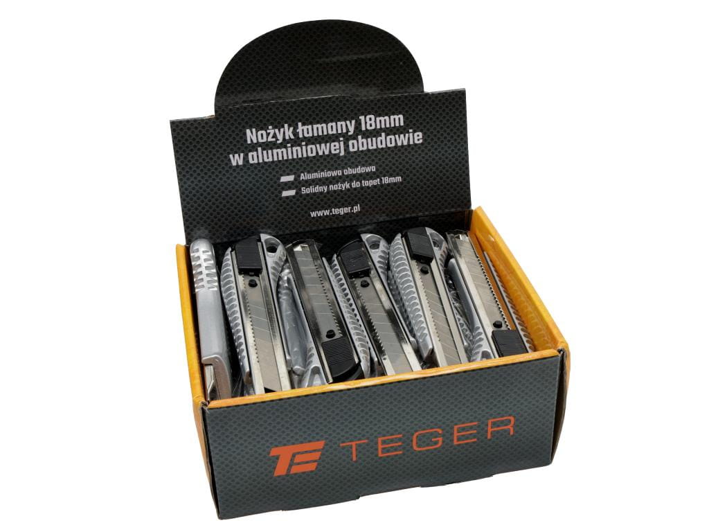 Nożyki łamane 18mm w aluminiowej obudowie w kartoniku ekspozycyjnym Teger (zestaw 24 sztuk)