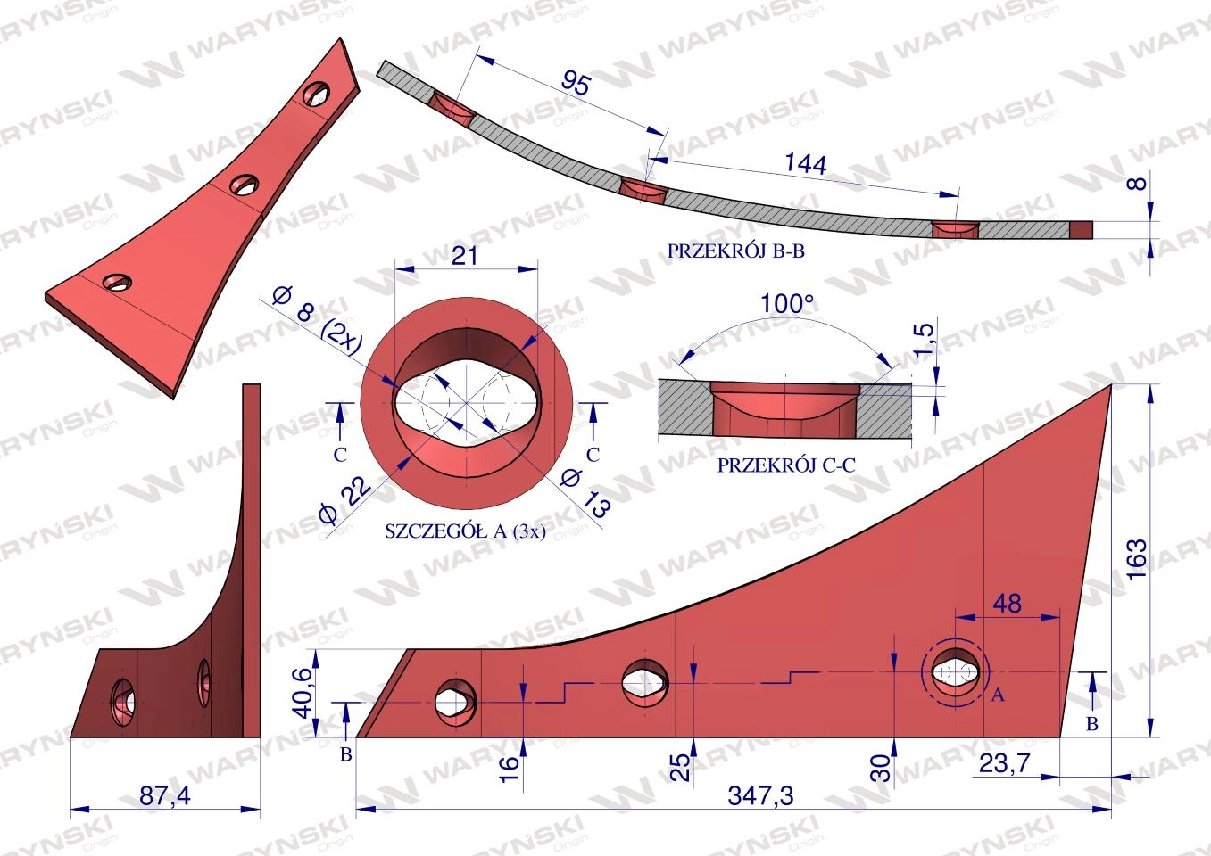 Części robocze marki WARYŃSKI wykonane są z niezwykle wytrzymałej i odpornej na ścieranie stali borowej pochodzącej z europejskich hut. Każda, nawet najmniejsza dostawa, posiada dołączony certyfikat potwierdzający skład materiałowy. Stal borowa posiada właściwości szczególnie przydatne w zastosowaniach konstrukcyjnych wymagających dużej wytrzymałości. Połączenie wysokogatunkowej stali borowej, monitorowanego procesu obróbki cieplnej oraz skrupulatna kontrola jakości produktów WARYŃSKI to gwarancja wydłużonego okresu eksploatacji. Produkty WARYŃSKI to oszczędność kosztów związanych z powolnym ścieraniem i zużyciem części roboczych. W trosce o trwałość naszych produktów oraz zadowolenie klientów proces produkcji lemieszy WARYŃSKI nie zakłada operacji spawania. Wszystkie rodzaje otworów są wykonane w specjalny sposób minimalizujący naprężenia oraz zmniejszający ryzyko pęknięć.