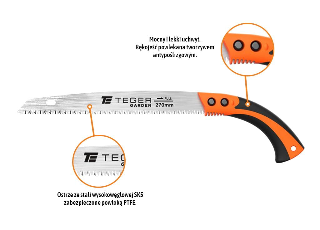 Właściwości: Piła TEGER wyposażona jest w mocny i lekki uchwyt, rękojeść powlekana tworzywem antypoślizgowym zapewnia pewny i bezpieczny chwyt w czasie pracy. Ostrza piły wykonane są z wysokowęglowej stali nożycowej (SK5 - High Carbon Steel)