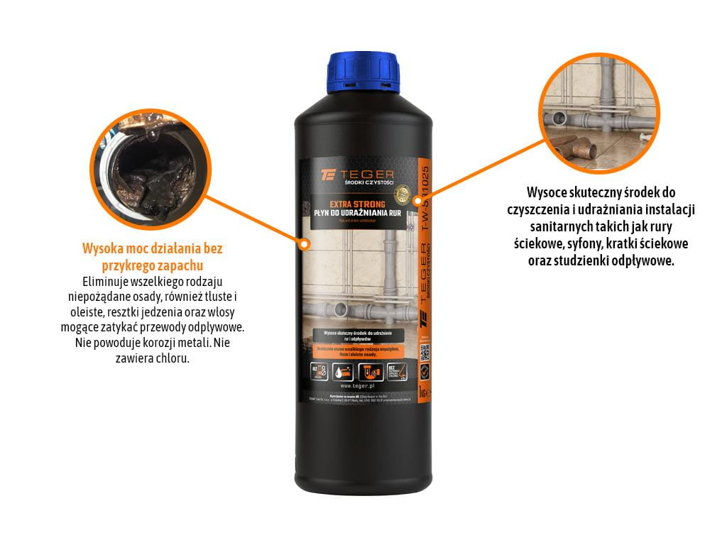 Płyn do udrażniania rur EXTRA STRONG TEGER to wysoce skuteczny środek do czyszczenia i udrażniania urządzeń sanitarnych oraz kratek ściekowych, syfonów i studzienek odpływowych, eliminuje wszelkiego rodzaju niepożądane osady. Bardzo skuteczny w działaniu, rozpuszcza złogi powstałe z resztek mydła, włosów, tłuszczu, żywności, regularne stosowanie preparatu zapobiega zatykaniu rur, usuwa nieprzyjemne zapachy.