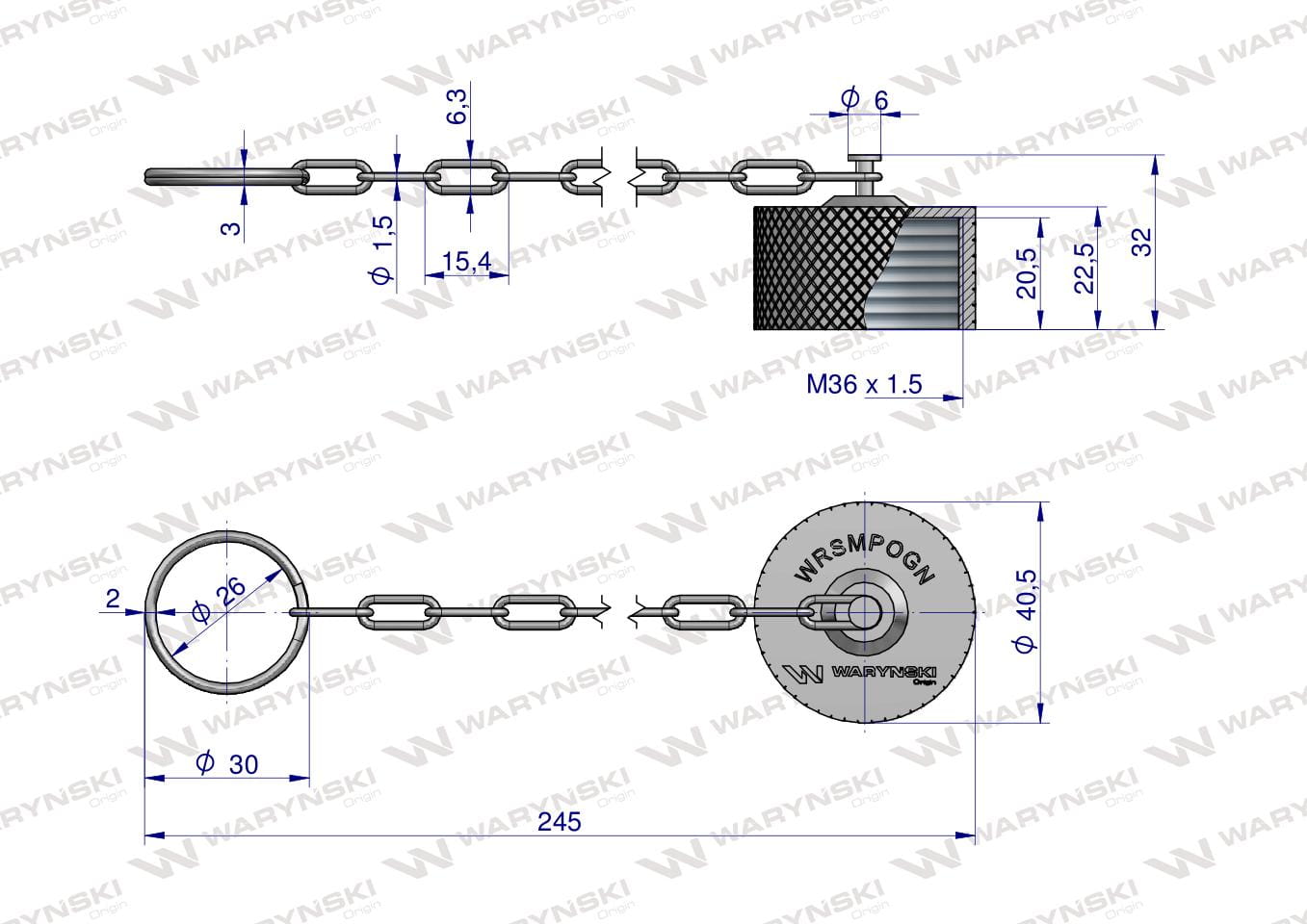 Pokrywa aluminiowa (korek) z gwintem wewnętrznym z łańcuszkiem idealnie pasuje do zaworów skręcanych - gniazd serii WRS Waryński. Zabezpiecza szybkozłącze i układ hydrauliczny przed wszelkiego rodzaju zabrudzeniami podczas pracy.;WRSM22GN, WRSM18GN, WRSM20GN, WRSM22WEWGN