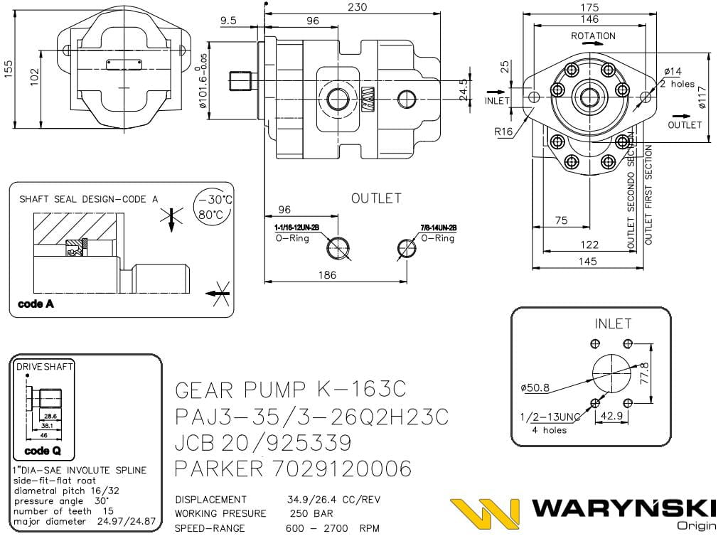 Pompa hydrauliczna K-163C JCB 214 3CX, 3CX CONfor, 4CX, Sitemaster PAJ3-35/3-26Q2H23C Waryński