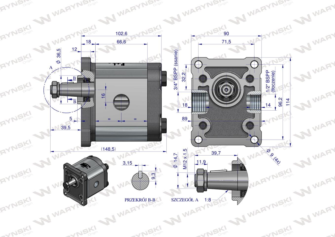 Pompa hydrauliczna zębata 16.0cm3 (grupa 2 - typ europejski) wałek 1:8 przyłącza gwintowane (obroty prawe) max.260 bar Waryński