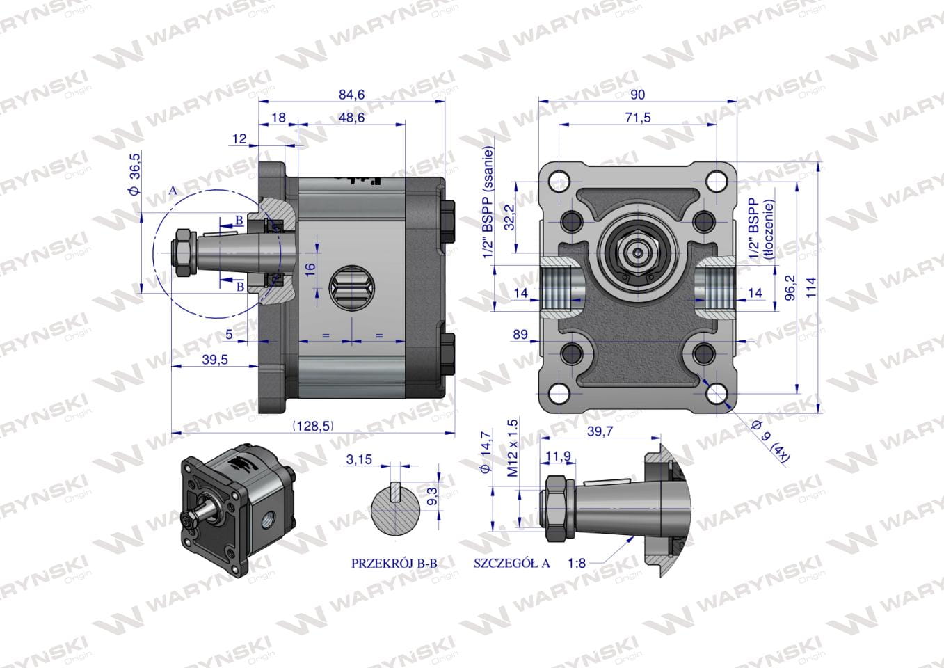 Pompa hydrauliczna zębata 4.0cm3 (grupa 2 - typ europejski) wałek 1:8 przyłącza gwintowane (obroty prawe) max.260 bar Waryński