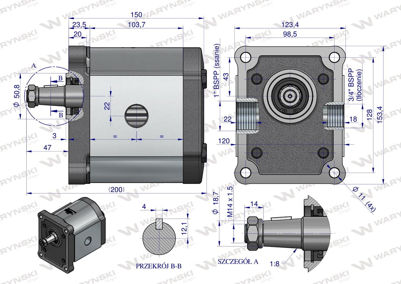 Pompa hydrauliczna zębata 52.0cm3 (grupa 3 - typ europejski) wałek 1:8 przyłącza gwintowane (obroty prawe) max.210 bar Waryński