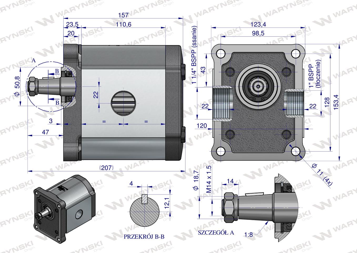 Pompa hydrauliczna zębata 61.0cm3 (grupa 3 - typ europejski) wałek 1:8 przyłącza gwintowane (obroty prawe) max.190 bar Waryński