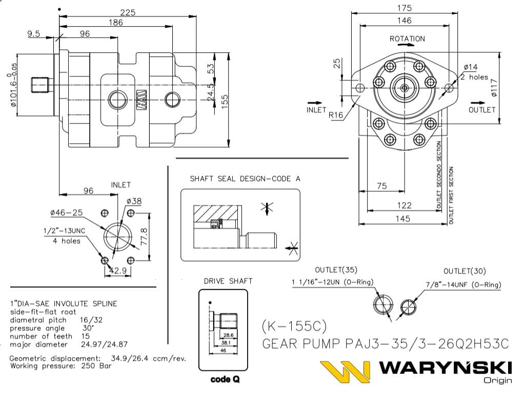 Pompa zębata JCB 3CX, 4CX 36/26 cc/rev PAJ3-35/3-26Q2H53C Waryński