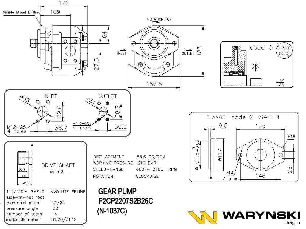 Pompa zębata JCB 412,415, 712, 712B P2CP2207S2B26C Waryński