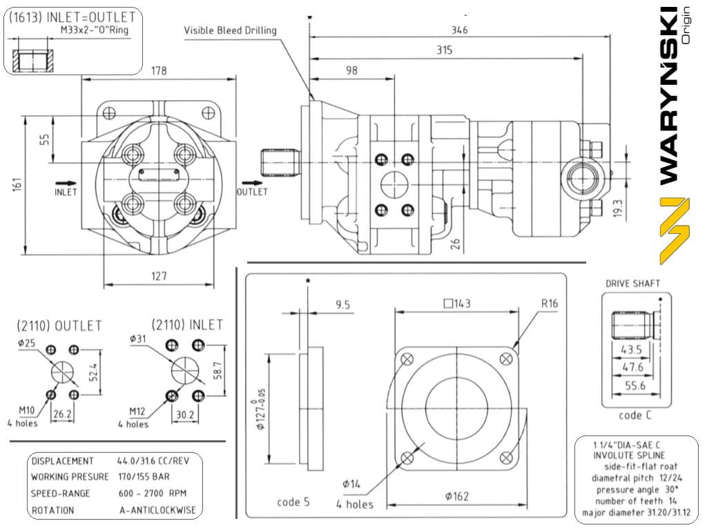 Pompa hydrauliczna zębata 2.5cm3 (grupa 1 - typ europejski) wałek 1:8 przyłącza obustronnie gwinty wewnętrzne 3/8 (obroty prawe) max.260 bar Waryński 546,85 zł -