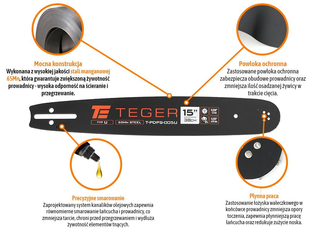 Prowadnica łańcucha do piły 15" (38 cm) / 0,325" 1,5mm 64 og. / 12z / moc. U / TEGER wytrzymała i precyzyjnie wykonana, przeznaczona do pił łańcuchowych, wykorzystywana zarówno przez profesjonalistów, jak i użytkowników domowych. Dzięki wysokiej jakości materiałom i solidnej konstrukcji zapewnia płynną i precyzyjną pracę łańcucha, minimalizując ryzyko przegrzewania oraz nadmiernego zużycia. Przeznaczona do użycia z łańcuchem: T-LDPS-005 TEGER oraz z łańcuchami innych marek które obsługują mocowanie U. Kompatybilna z łańcuchem pełne dłuto i półdłuto. Przed zakupem należy sprawdzić zgodność parametrów prowadnicy z modelem posiadanej pilarki!