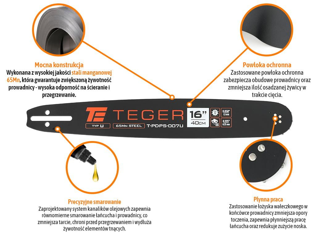 Narzędzia TEGER nadają się dla każdego majsterkowicza jak i profesjonalisty. Prowadnica łańcucha TEGER przeznaczona jest dla użytkowników którzy oczekują maksymalnej jakości. Doskonale sprawdza się w ciężkich i profesjonalnych warunkach gdzie liczy się szybkość oraz precyzja ciecia. Przeznaczona do wszystkich marek pił łańcuchowych - spalinowych i elektrycznych zgodnych z podaną specyfikacją.