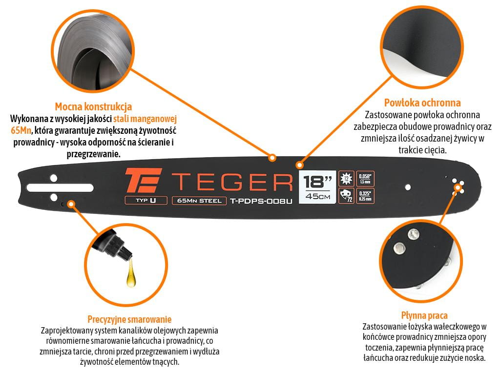 Prowadnica łańcucha do piły 18" (45 cm) / 0,325" 1,5mm 72 og. / 12z / moc. U / TEGER wytrzymała i precyzyjnie wykonana, przeznaczona do pił łańcuchowych, wykorzystywana zarówno przez profesjonalistów, jak i użytkowników domowych. Dzięki wysokiej jakości materiałom i solidnej konstrukcji zapewnia płynną i precyzyjną pracę łańcucha, minimalizując ryzyko przegrzewania oraz nadmiernego zużycia. Przeznaczona do użycia z łańcuchem: T-LDPS-008 TEGER oraz z łańcuchami innych marek które obsługują mocowanie U. Kompatybilna z łańcuchem pełne dłuto i półdłuto. Przed zakupem należy sprawdzić zgodność parametrów prowadnicy z modelem posiadanej pilarki!