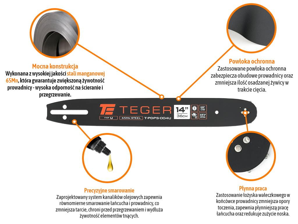 Prowadnica łańcucha do piły 14" (36 cm) / 3/8" 1,3mm 52 og. / 9z / moc. U / TEGER wytrzymała i precyzyjnie wykonana, przeznaczona do pił łańcuchowych, wykorzystywana zarówno przez profesjonalistów, jak i użytkowników domowych.