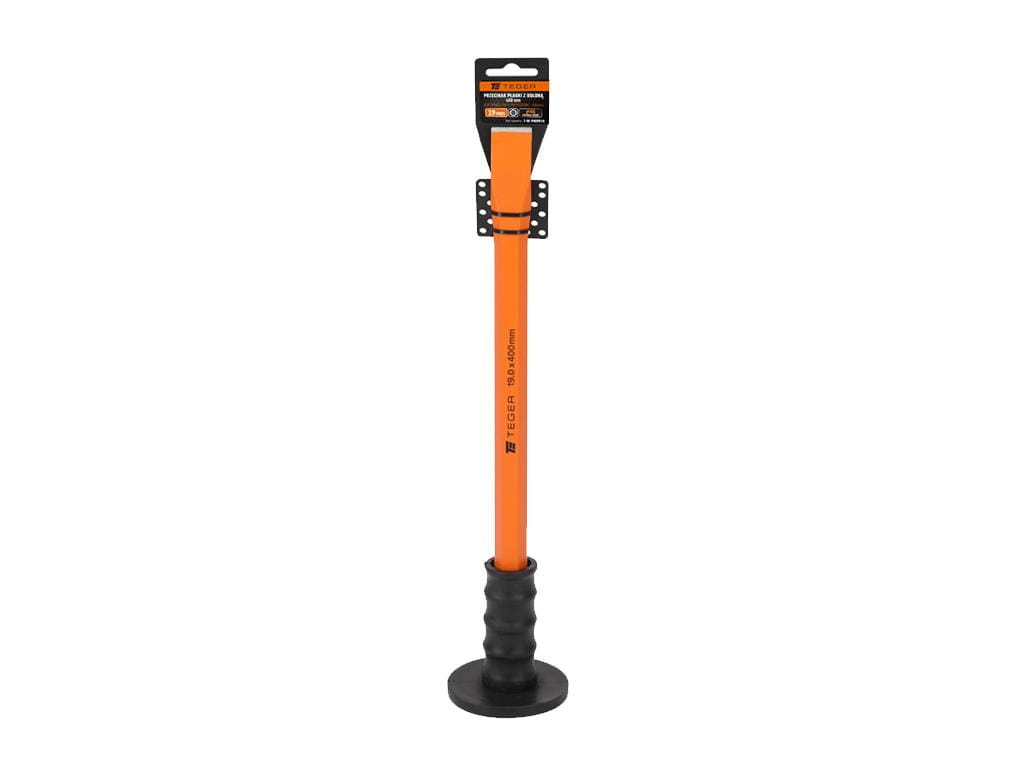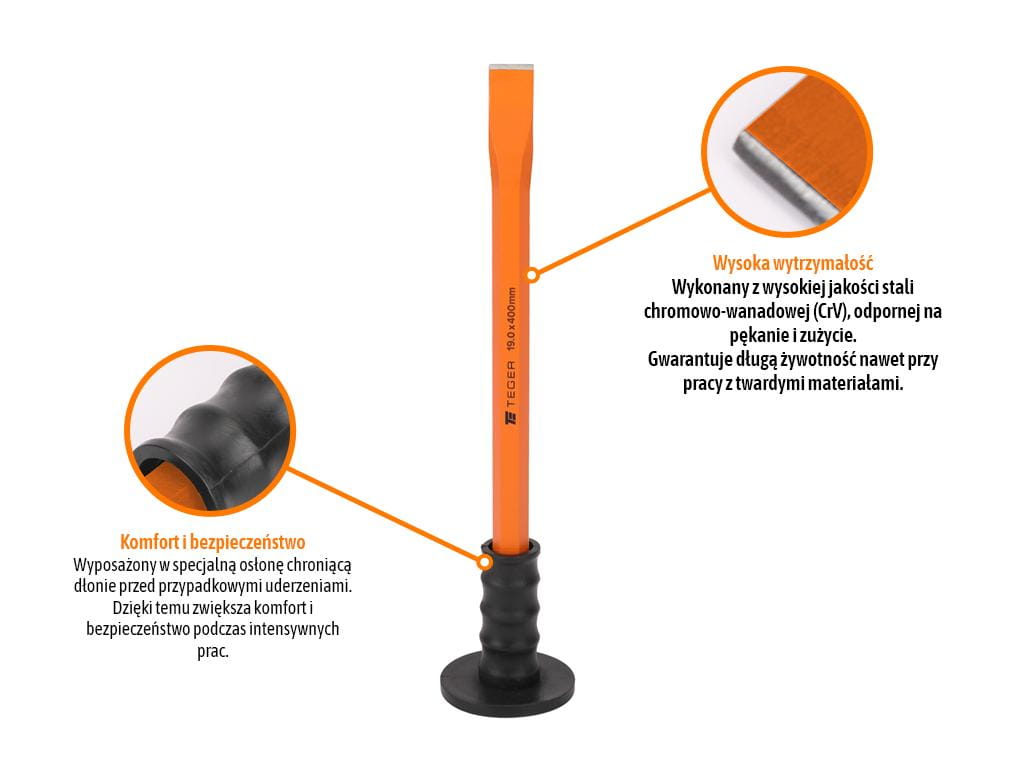 Przecinak płaski z osłoną 19x400 mm Teger to profesjonalne narzędzie przeznaczone do obróbki metalu, betonu i innych twardych materiałów. Wykonany z wysokiej jakości stali węglowej, zapewnia dużą wytrzymałość i długą żywotność. Posiada utwardzoną końcówkę, co zwiększa jego odporność na zużycie. Dodatkowo wyposażony jest w ergonomiczną osłonę ochronną, która zabezpiecza dłoń przed urazami podczas pracy. Przecinak jest idealnym wyborem zarówno dla profesjonalistów, jak i majsterkowiczów, którzy potrzebują niezawodnego narzędzia do precyzyjnego kucia, skuwania i cięcia.