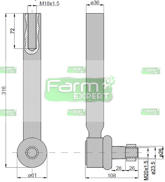 Przegub kierowniczy 285mm - M18x1,5 3764028M2 Massey Ferguson TAQ