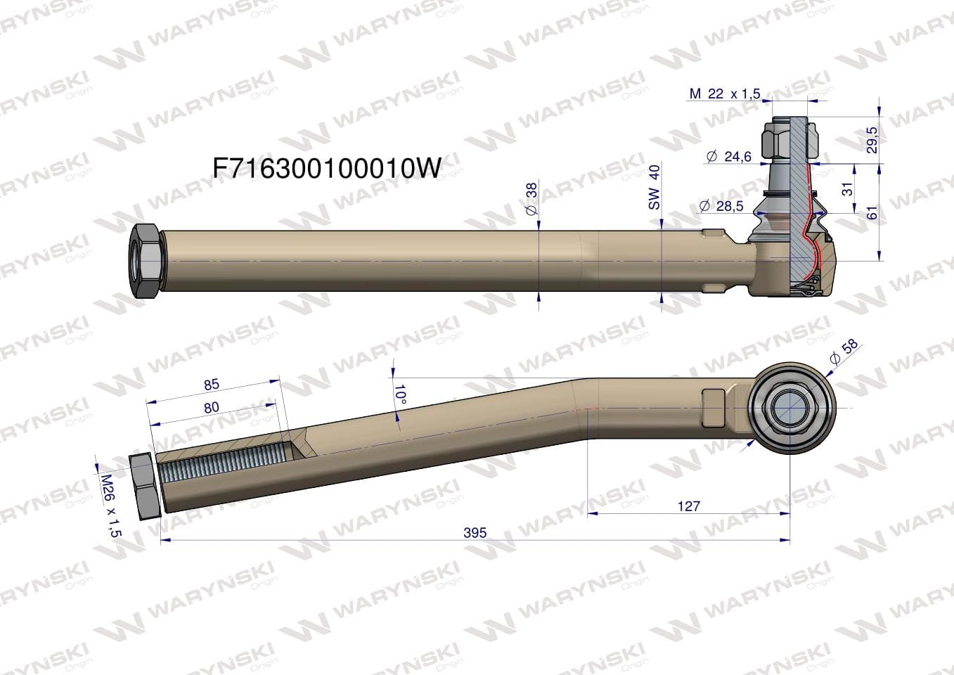 Przegub kierowniczy lewy 395mm- M26x1,5 F716300100010 WARYŃSKI