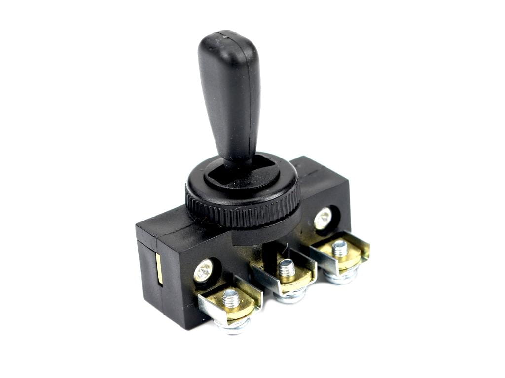 W przełączniku znajdują się trzy przyłącza śrubowe wykonane z miedzi jego konstrukcja jest hebelkowa dwupołożeniową.