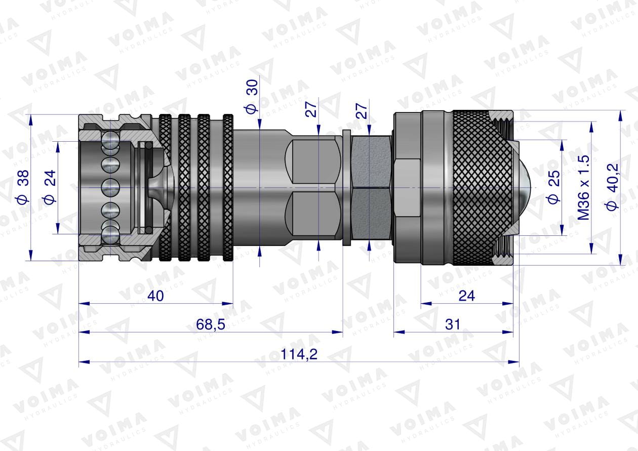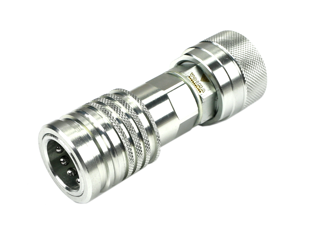 Zastosowanie: Redukcja gniazdo/wtyczka EURO skręcane VOIMA stosowane w maszynach rolniczych. Z uwagi na konstrukcję złączy starego typu z gniazdem kulowym bez uszczelnień nieuniknione jest pojawienie się śladowych ilości oleju w miejscu bezpośredniego styku gniazda z wtyczką w pozycji rozłączonej. Zjawisko to będzie niezauważalne w złączach nowego typu ISO 7241-A (EURO) i ISO 16028 (suchoodcinające).