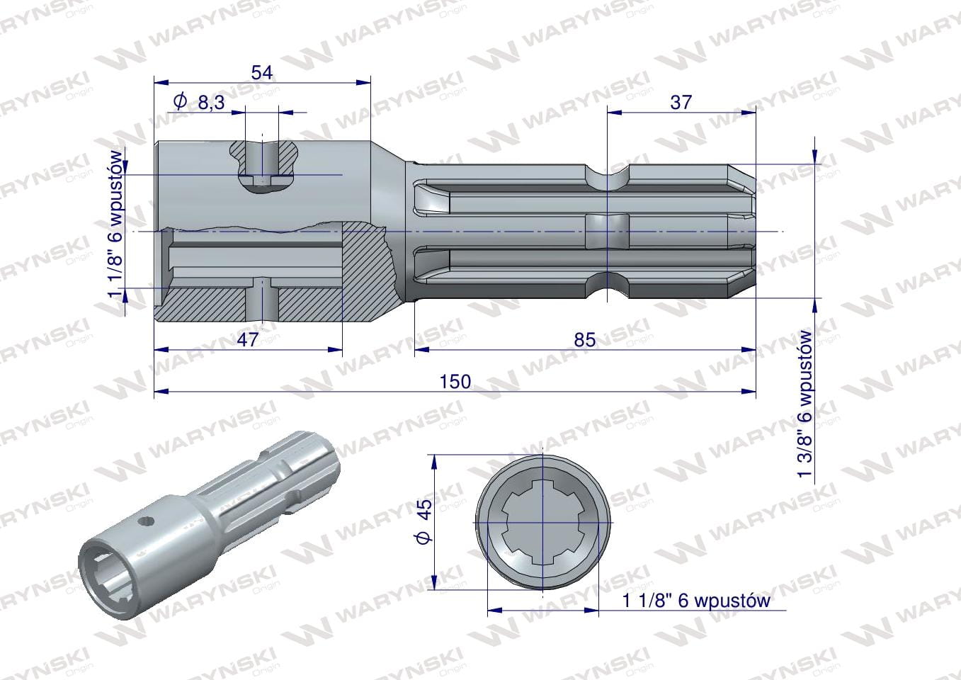 Redukcja adapter z otworem zabezpieczającym 1 1/8" 6 wpustów na wałek 1 3/8" 6 wpustów WARYŃSKI