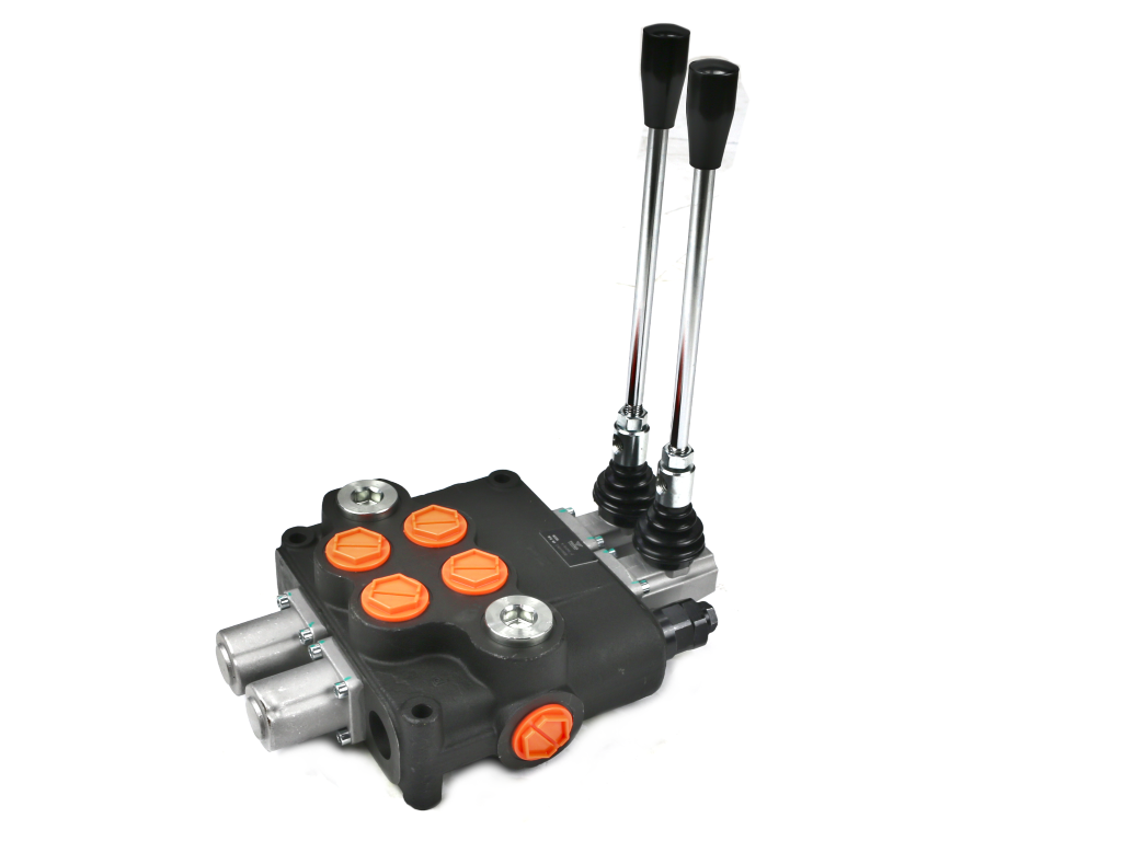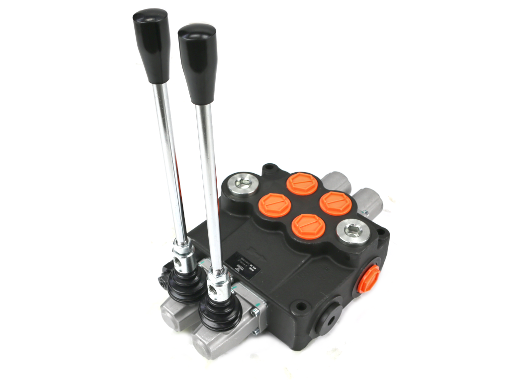 Rozdzielacz hydrauliczny 2-sekcyjny 120L VOIMA - monoblokowy z układem równoległym z neutralną pozycją środkową. Olej w pozycji neutralnej krąży między pompą hydrauliczną a zbiornikiem.