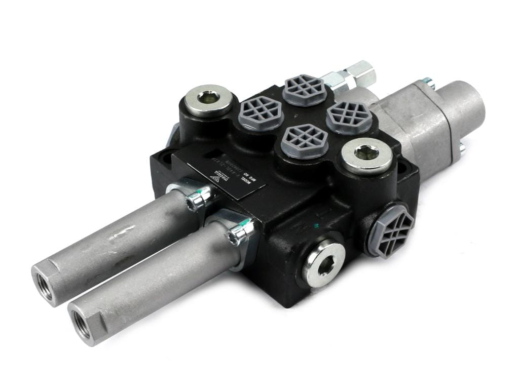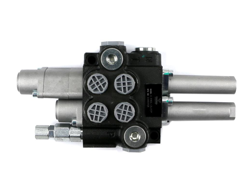 Monoblokowy z układem równoległym z neutralną pozycją środkową. Olej w pozycji neutralnej krąży między pompą hydrauliczną a zbiornikiem. Jedna sekcja: pływająca (z zatrzaskiem).