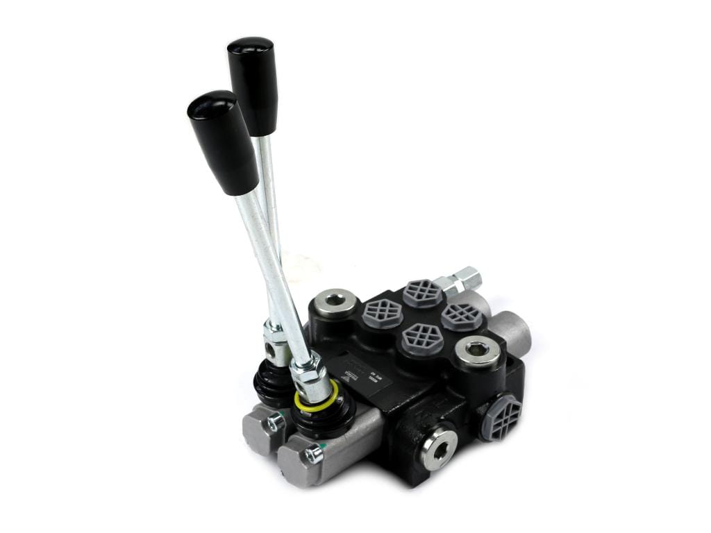 Rozdzielacz hydrauliczny 2-sekcyjny 40L (1 sekcja - z zatrzaskiem) VOIMA - monoblokowy z układem równoległym z neutralną pozycją środkową. Olej w pozycji neutralnej krąży między pompą hydrauliczną a zbiornikiem.