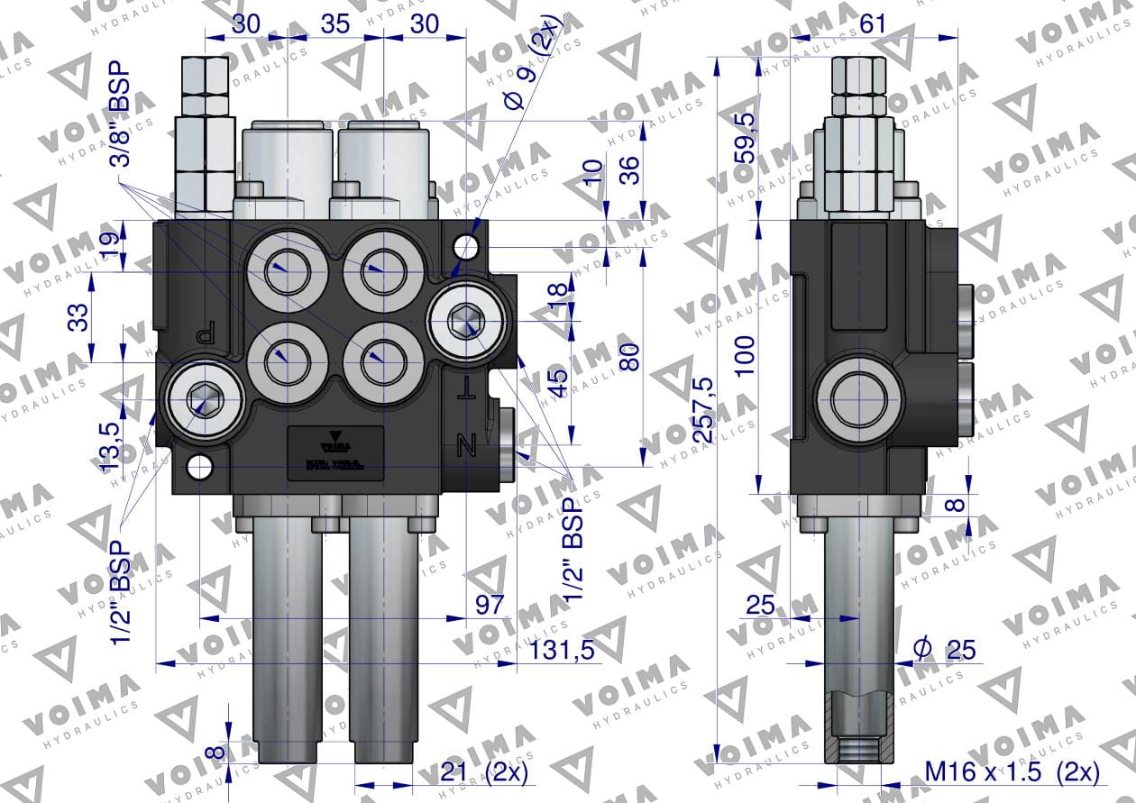 Rozdzielacz hydrauliczny 2-sekcyjny 40L sterowany joystickiem na linkę VOIMA - monoblokowy z układem równoległym z neutralną pozycją środkową. Olej w pozycji neutralnej krąży między pompą hydrauliczną a zbiornikiem.