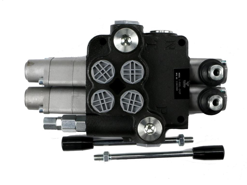 Rozdzielacz hydrauliczny 2-sekcyjny 80L (2 sekcje - pływające) VOIMA - monoblokowy z układem równoległym z neutralną pozycją środkową. Olej w pozycji neutralnej krąży między pompą hydrauliczną a zbiornikiem. Sekcje pływające (z zatrzaskiem).