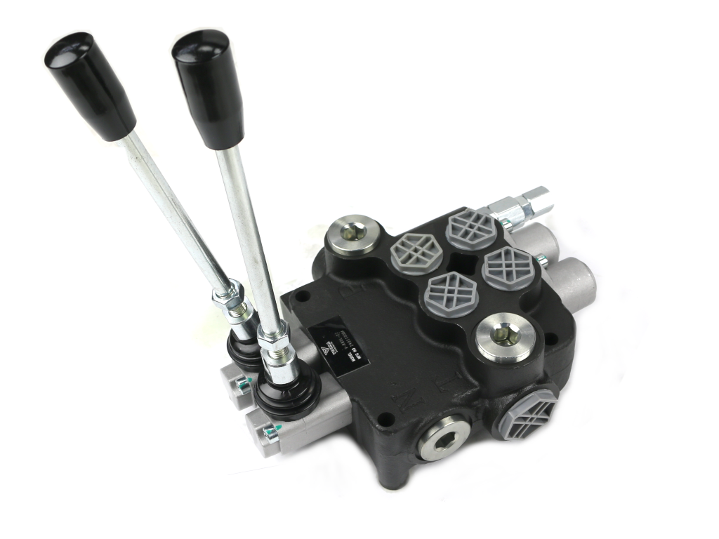 Rozdzielacz hydrauliczny 2-sekcyjny 80L z zatrzaskami na 2 sekcjach VOIMA - monoblokowy z układem równoległym z neutralną pozycją środkową. Olej w pozycji neutralnej krąży między pompą hydrauliczną a zbiornikiem.