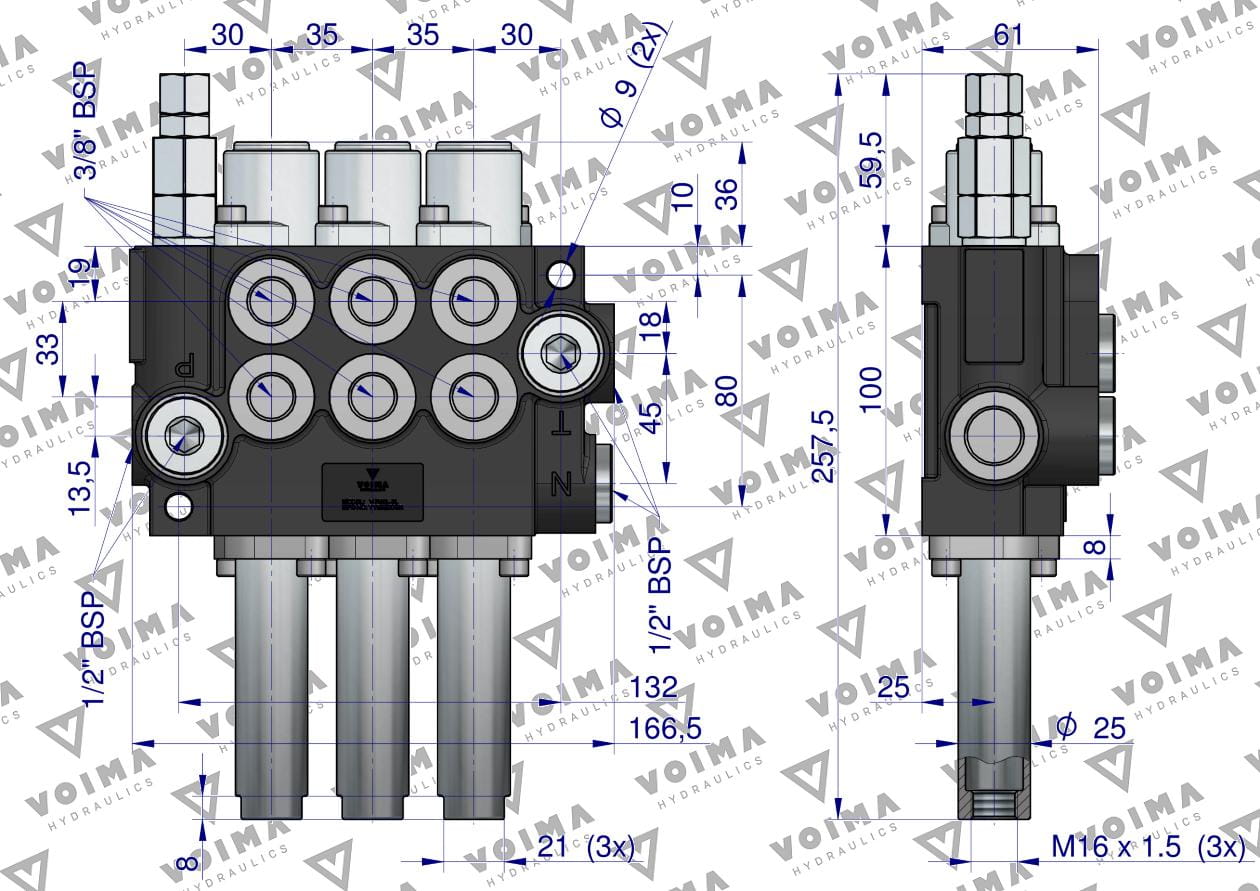 Rozdzielacz hydrauliczny 3-sekcyjny 40L sterowany joystickiem na linkę VOIMA