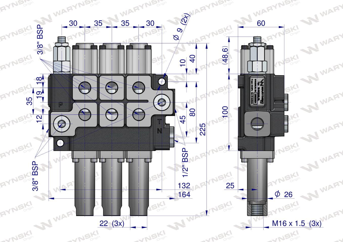 Rozdzielacz hydrauliczny 3-sekcyjny Waryński - monoblokowy z układem równoległym z neutralną pozycją środkową sterowany linkami